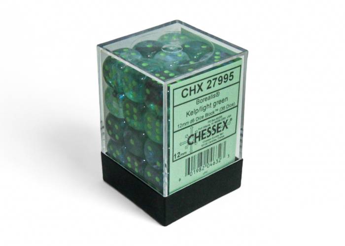 Each Set contains 36 Borealis Kelp 12mm d6 dice with light green pips (DB1295) in 02804 Display Case with Lid This color has our Luminary™ effect. It can look like stars in the dark (with enough light exposure beforehand or under a black light).