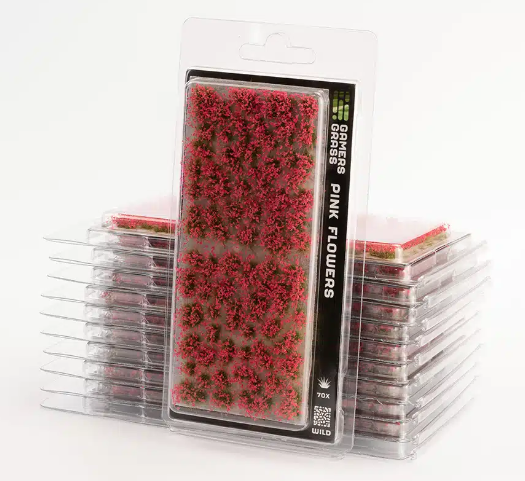 Tufts covered with pink petals. All kinds of herbs and bushes with rose flowers like garden roses, camellias, chrysanths, hydrangeas, hibiscus, azaleas, lilacs, rhododendrons, or wild rockroses and heaths can be recreated. Alone or mixed with other tufts, will make your bases and dioramas astonishingly colorful and delightful.